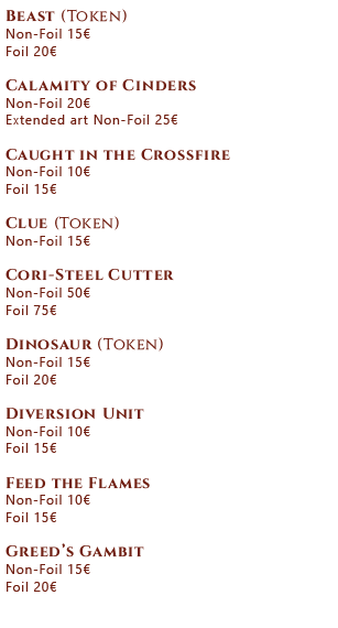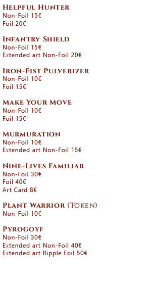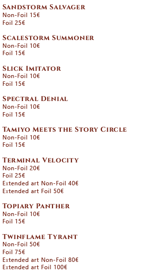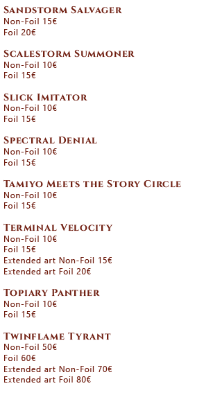 40€ each (shipping not included)These exclusive playmats from UltraPRO feature the art from Twinflame Tyrant and Cori-Steel Cutter.Approximately 60,5 x 34,5 cm / 23.8 x 13.6 in. With stitched edges to increase the durability.Each playmat is signed on the bottom left, but let me know if you prefer it unsigned.Please contact me at: xabigaztelua@gmail.com